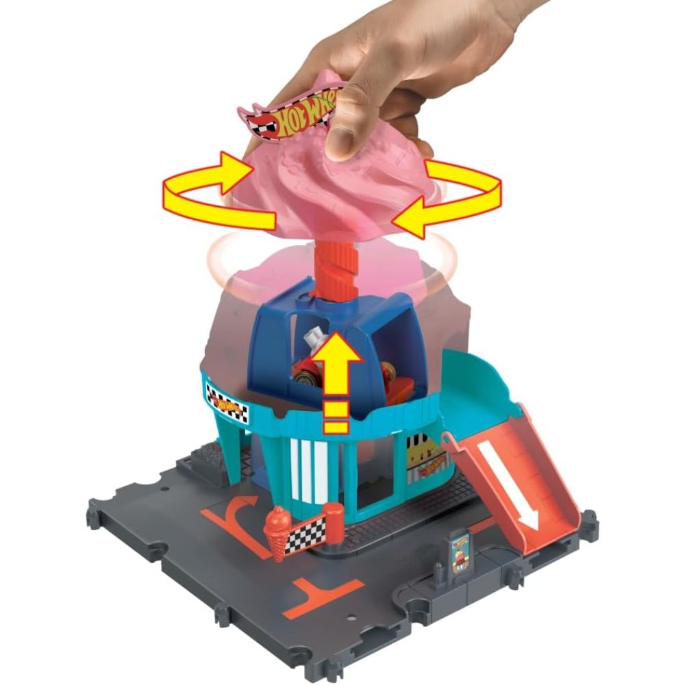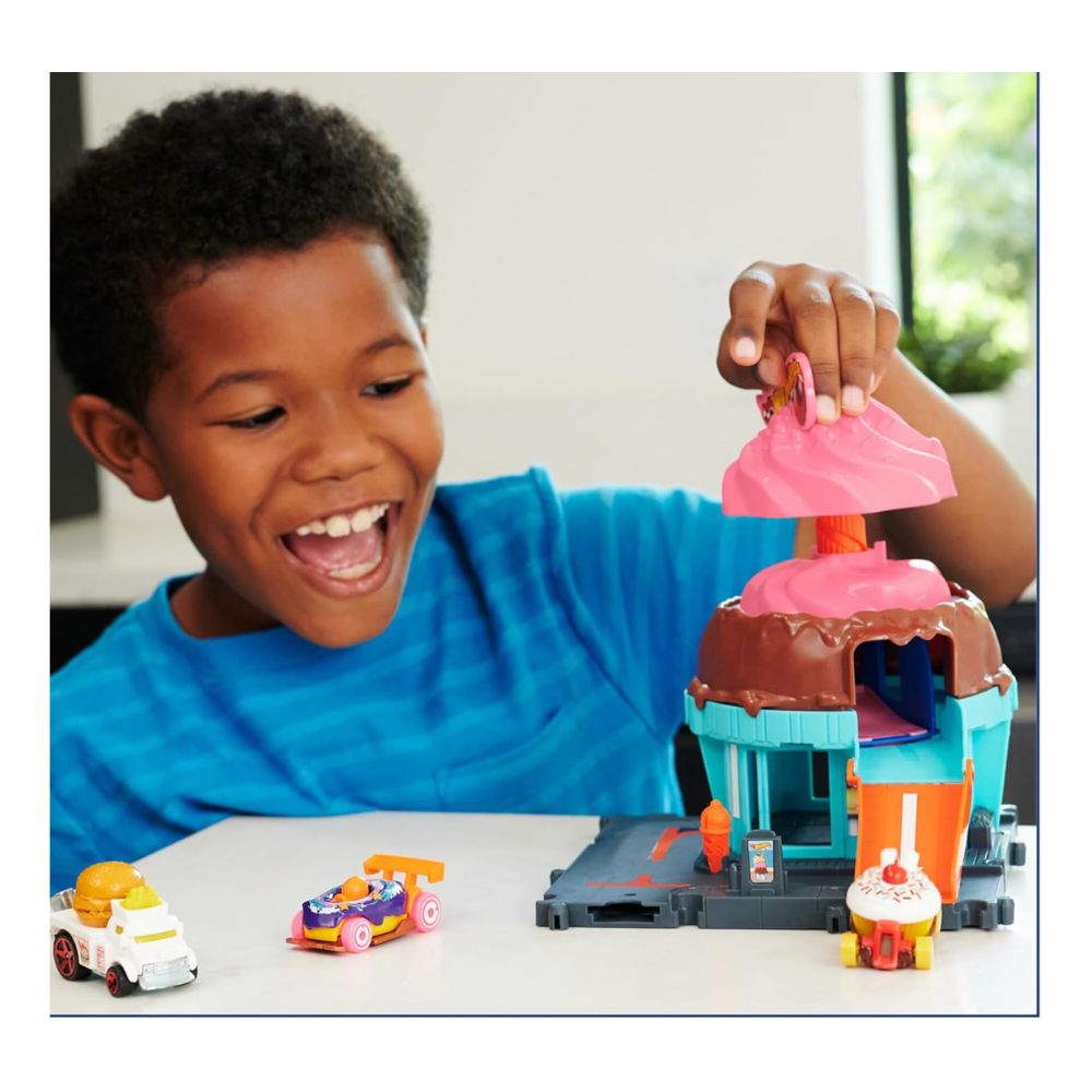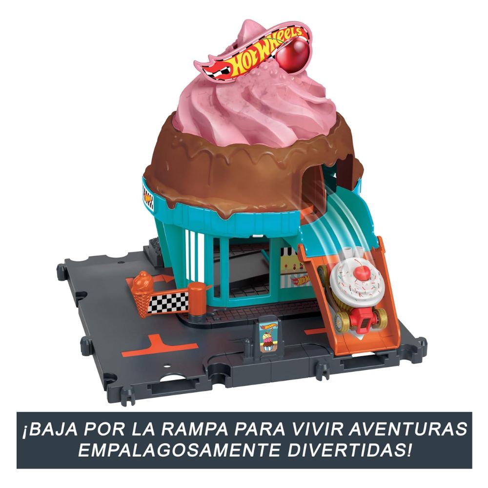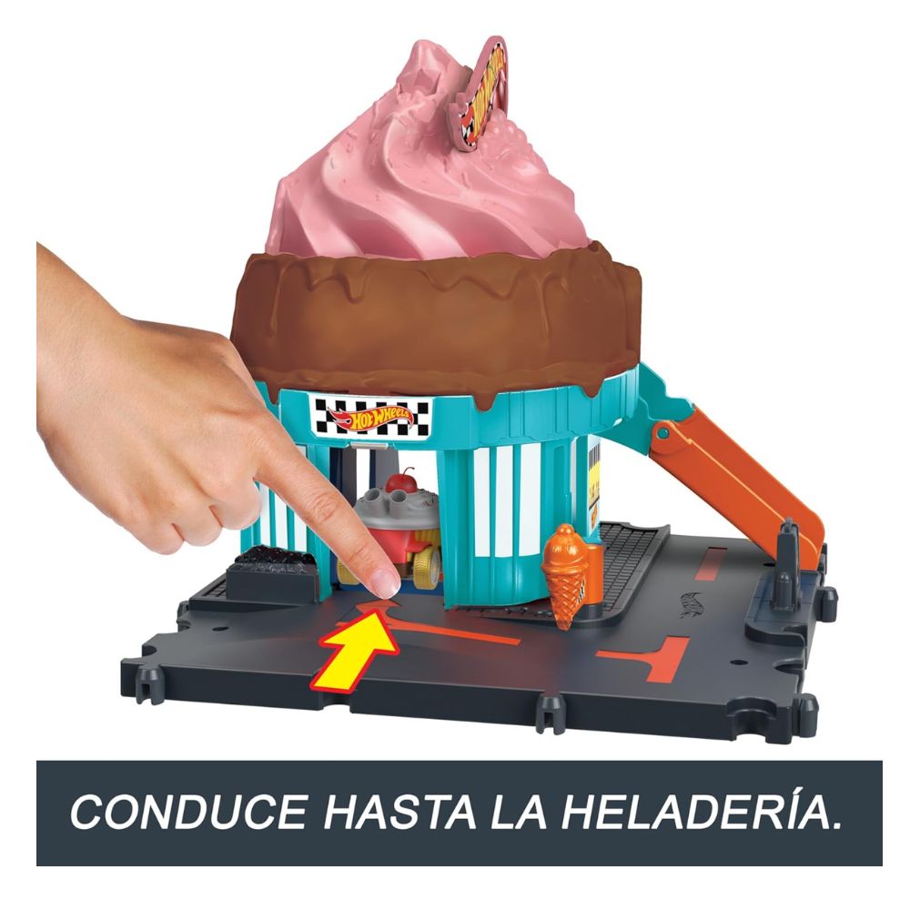 Vive emocionantes y dulces aventuras con la pista Heladería en la ciudad de Hot Wheels. Este divertido conjunto de juego permite a los niños y niñas acelerar a toda velocidad por una pista temática que los lleva directamente a una heladería gigante. Al pasar por el letrero de desvío, el coche entra en un enorme cono de helado y, al girar el logotipo de Hot Wheels, se eleva por una espiral hasta alcanzar la cima y lanzarse por una rampa plegable para continuar la acción.