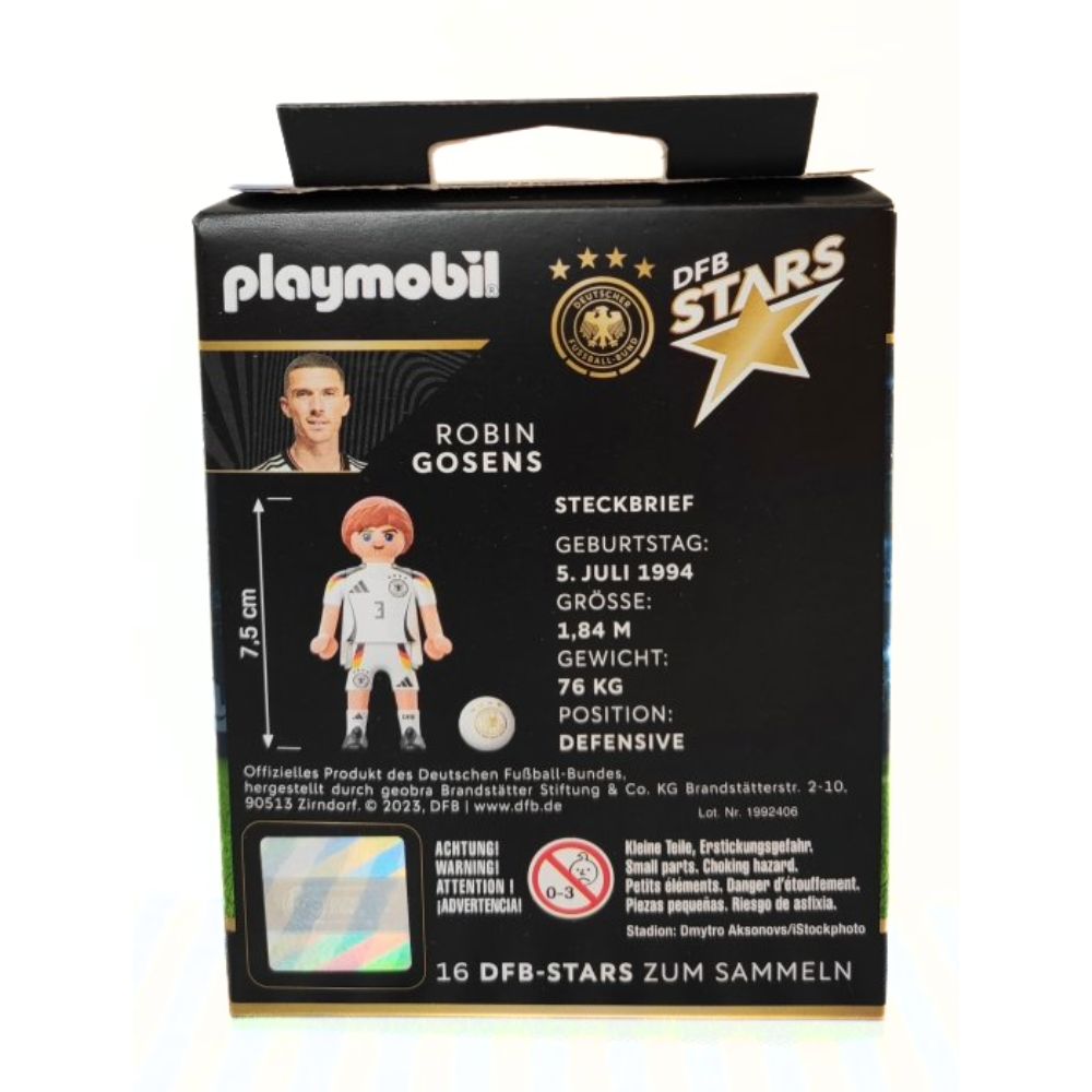 El Playmobil 71666 Robin Gosens – DFB Stars Alemania es una figura exclusiva de coleccionista que rinde homenaje al futbolista internacional alemán. Este artículo forma parte de la serie DFB Stars, creada con motivo del 50 aniversario de Playmobil, una colección especial diseñada para conmemorar medio siglo de historia de la marca.