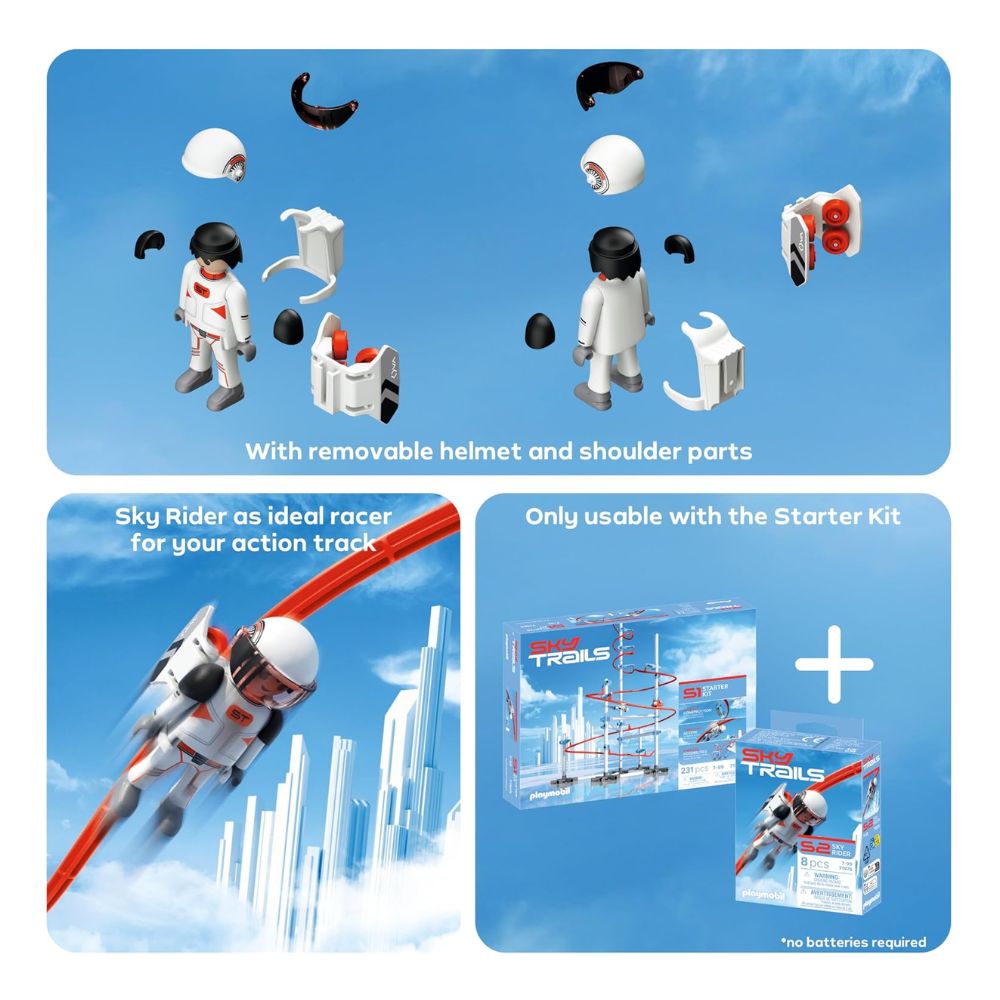 Compatible con el Starter Kit Sky Trails (ref. 71969) y otros sets de la misma línea, este rider te permite crear competiciones aún más intensas y creativas. Solo tienes que añadirlo a tu colección para multiplicar la emoción y descubrir quién es el más rápido sobre las pistas del cielo.