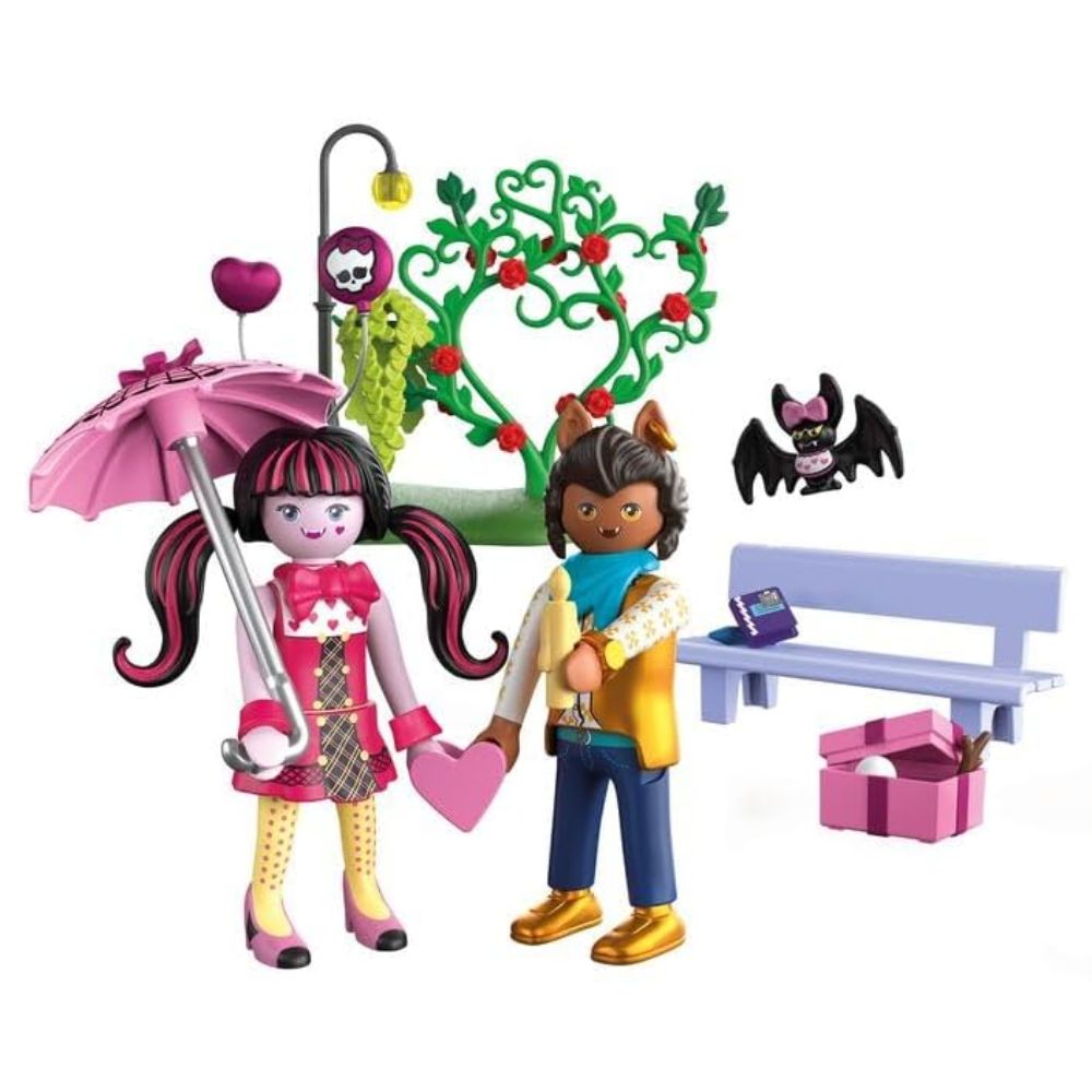 Celebra el amor más monstruosamente adorable con Playmobil 72043 Draculaura Cita San Valentín Monster High, un encantador set que recrea una escena romántica llena de detalles y diversión. Este escenario incluye a Draculaura y Clawd, que pueden unirse mediante un soporte en forma de corazón para conseguir la pose perfecta de pareja, ideal para dar vida a historias llenas de ternura y fantasía.