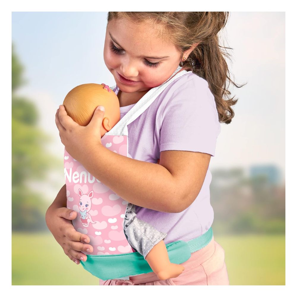 El Portabebés Nenuco para muñecos es el accesorio ideal para que los más pequeños disfruten llevando a sus muñecos a todas partes como si fueran auténticos papás y mamás. Con un diseño en colores pastel rosa y verde, incluye un dulce estampado de un pajarito en el centro, lo que lo hace aún más encantador y atractivo para el juego infantil.