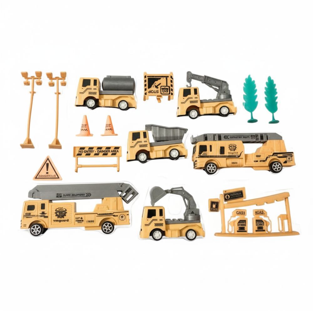 Contiene 6 vehículos de plástico de obras y accesorios.